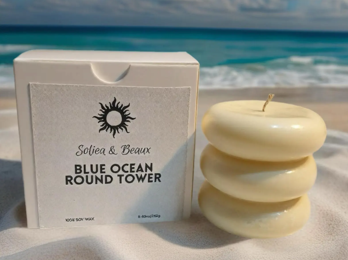 Embrace the calm of the coast with our Blue Ocean Round Tower Candle, hand-poured with 100% natural soy wax for a clean, even burn.